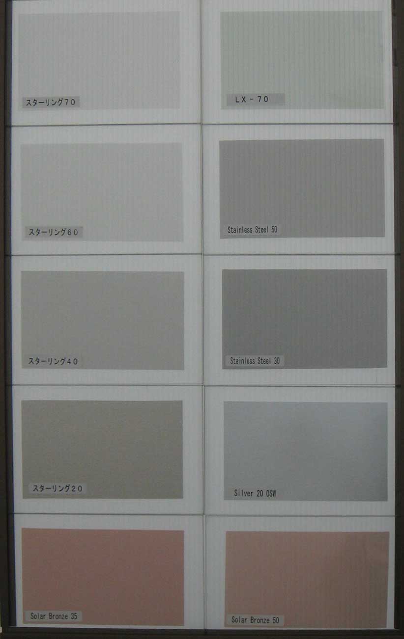 スパッタリングに使用する金属の種類や量を変える事により、ほぼ透明な物から、グレー、シルバー等濃色のものまで幅広く取りそろえています。その中から、お客様の使用目的に合った商品をご提案させていただきます。