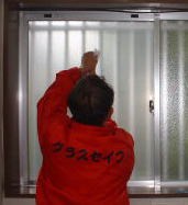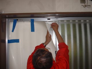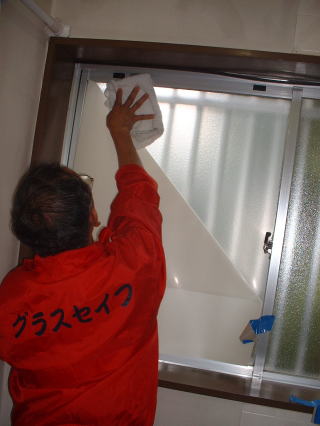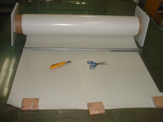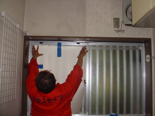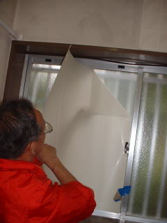 離形紙をはがさずに、ガラスに当て、寸法確認を行い粘着テープ(ガムテープは強すぎて、サッシを汚します)で、仮止めします