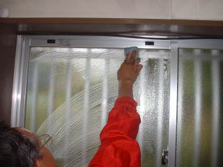 洗剤を含ませたスポンジたわしなど、ガラスを傷つけないタワシが有効です。油分の付着が多い場合は、アルコールやシンナーの使用もやむをえません。洗浄後は、水をスプレーし、洗剤分を取り除き、キッチンペーパーなどで拭き取ります。