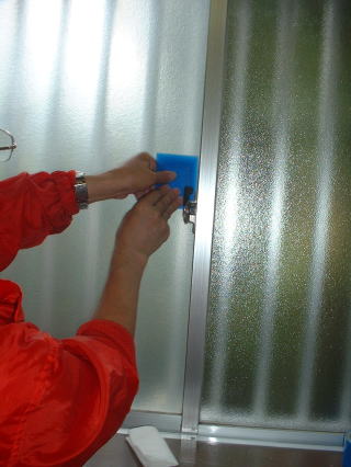 フィルムの裏側に手を伸ばし、離形紙を剥がしながら、フィルムを貼りこんでいきます